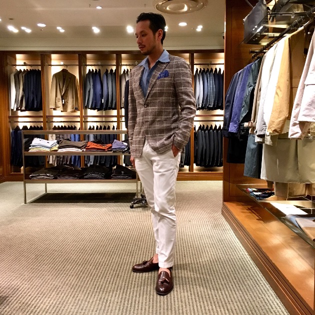 ボトムはペーンを拾ってホワイトパンツです。よりクリーンな印象になりますね。