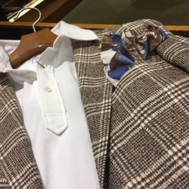 ホワイトのポロシャツを立体的にニュアンスを付けてエリを出し、光沢のあるチーフで素材感にメリハリを。