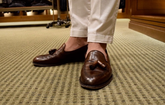 足下はダークブラウンのカーフです。柔らかい印象のコーディネートをギュッと引き締めます。