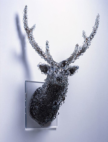 「PixCell」シリーズはネット上で出会ったモチーフを実際に取り寄せ、その表面をガラスビーズで覆ってつくられている。"もの"の表面にビーズという透明の球体をのせることで、「もの」は「像」に変化する。そして、その"像"は、一人一人の脳の中に、映像的な記憶として残る。
