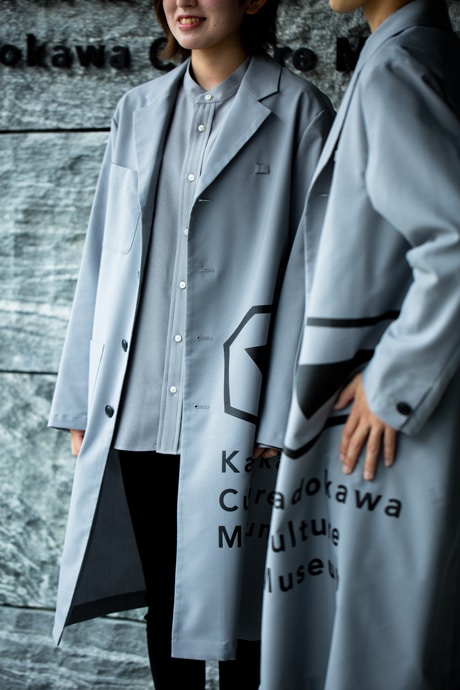 公益財団法人 角川文化振興財団が、埼玉県所沢市にグランドオープンした「角川武蔵野ミュージアム」の館内スタッフ制服をプロデュース。制服はカフェ接客や図書館での作業も想定し大型ポケットとペン入れを備えた「エプロン」と、左右非対称のポケット配置が印象的な案内スタッフ用「ショップコート」、そしてコートと合わせるクリーンな「スタンドカラーシャツ」の3種。 いずれのアイテムもグレーを基調にブラックのロゴを大胆に配したデザインで、石材を用いた多面体のミュージアム建築を想起させる仕上がりとなっている。