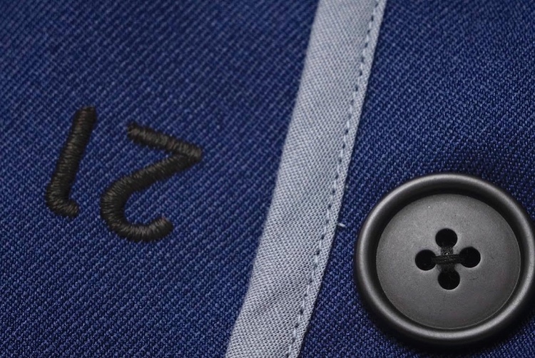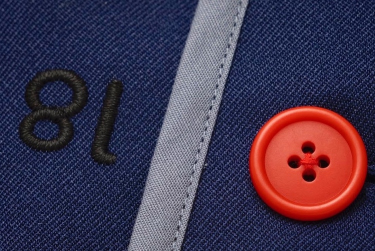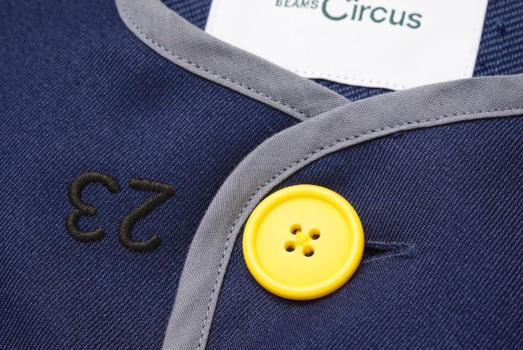 元々の園服がセーラー服で、それも十分可愛らしかったのと、東郷平八郎さんの海軍のイメージもあったことから、セーラーの形は踏襲。全体のデザインも東郷神社にある勝旗という勝利の旗の色などを参考に落とし込みました。スプリットラグランといって、前身はセットインで、後ろはラグランになっている可動域を考えたパターンになっています。生地は吸湿速乾性があり、静電気防止という仕様。夕方幼稚園から帰って、洗濯機で洗って干しておけば、朝には乾いて着て行けるという機能性にこだわりました。子供の頃の記憶は大人になっても残るものですから、この頃から良いものを着てもらう服育というところもコンセプトにしました。園服は江戸川区のシャツ工場でハンドメイドで作ってもらい、全部総パイプになっている、とても手が込んでいるもの。細部までこだわって、着心地でその良さがわかるものにしたかったんです。ボタンに書かれている23、21、18という数字は23mm、21mm、18mmというボタンの大きさ。毎日着るものですから着ているだけで感覚が刷り込まれる。幼稚園バッグはブリーフィングのデザイナーの小雀新秀さんに、 帽子製作は帽子デザイナーのHICOSAKAさんにお願いしました。そういったセレクトの背景も使えることがビームスの強みでもあるので、存分に活かしました。