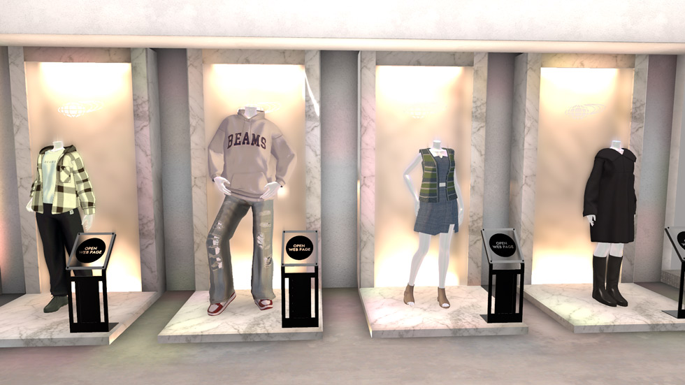 また、ワールド内にBEAMSの店舗を設置し、BEAMSがアバター用に販売する3D衣装を展示しているだけでなく試着もでき、撮影スタジオも完備しており、バーチャル空間ならではの内容となります。