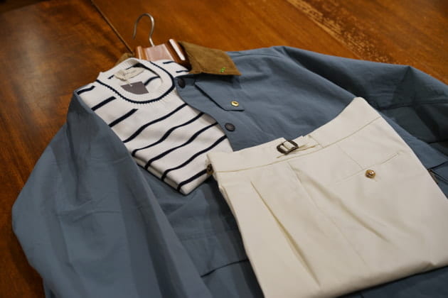 白パンツに合わせて、爽やかなコーディネート。