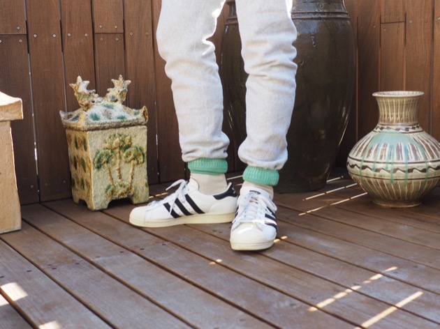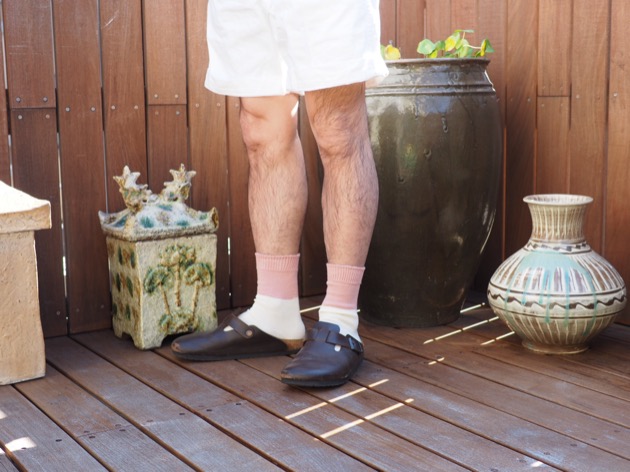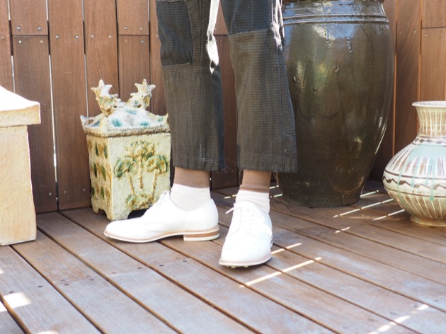 昨今、くるぶし丈のパンツが市民権を経たかのように、なんら抵抗なく世の中で多く目にする様になりました。コチラの2トーンソックス、そんなくるぶし丈のパンツに合わせる様に短いパンツ丈から見えるカラーと、短靴を履いた部分から見えるカラーとの絶妙なバランスを考慮して企画しました。見え方が面白いですね!。
