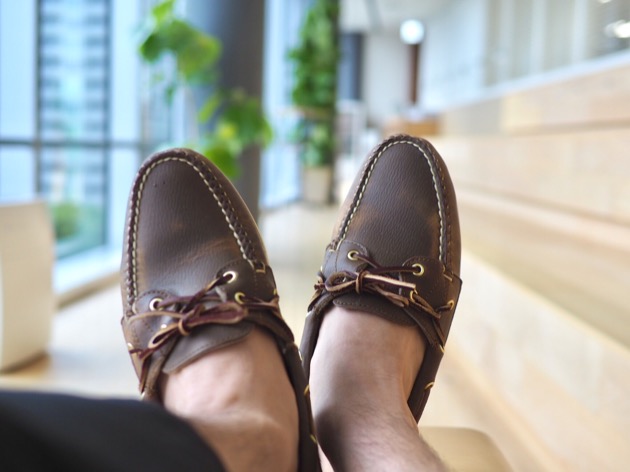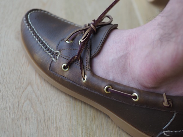 ボートモカシンは、特性上、足入れが広くてノーズが短いのが一般的。紐の結びも一捻り工夫します。サイドの紐に引っ掛けて結ぶ。『ホールド力が増す』のです。