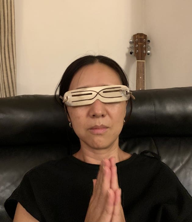 顔にぴったりとフィットしているため光が入るのはスリットを通してのみで、内側にはすすを塗ってまぶしさを軽減することもあるスリットは、光の入射量を減らすためだけでなく、視力を向上させるためにも狭くなっている。スリットの幅が広いほど視野は広くなる。