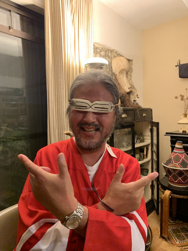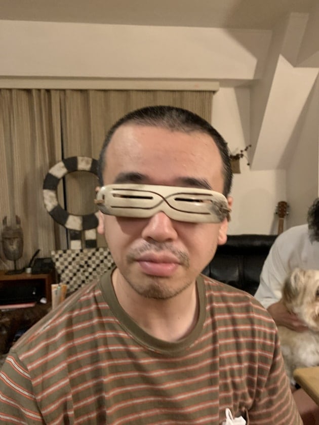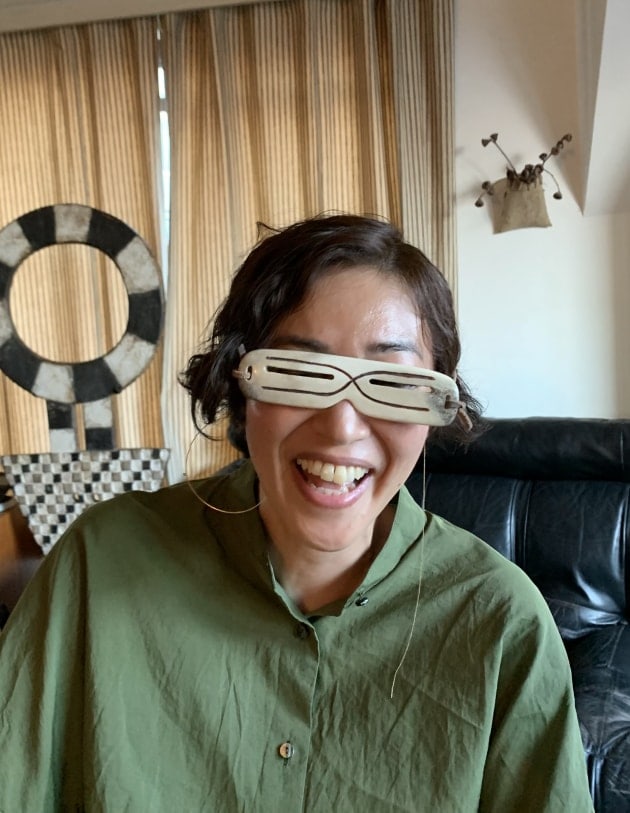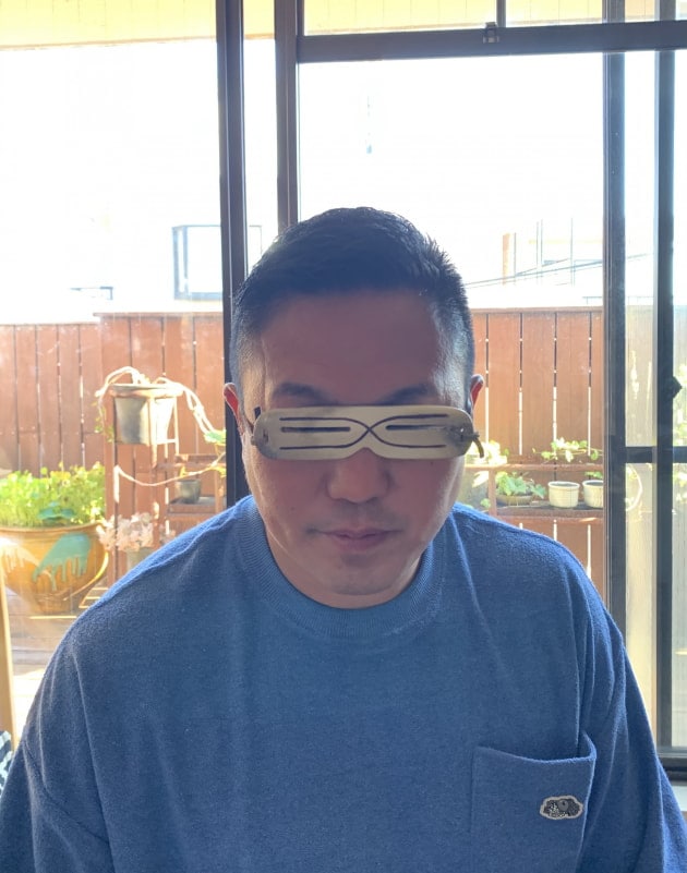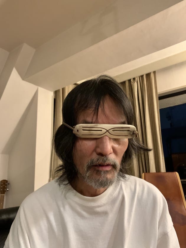 一先ず、我が家へ来客した方への恒例、「アラスカの遮光器」をつけてパチリと。