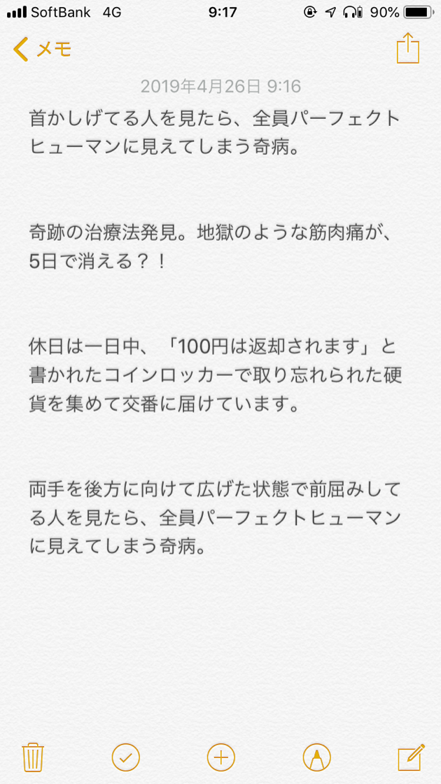 藤尾の究極のメモ術。その3 2019.04.26 朝の通勤列車の時間はとても貴重で、いつもこういうことばかり考えている。もしこれを時間の浪費じゃないかと感じている人に、告ぐ。ご指摘の通りです。ほら、なにより、ここ。気付いてくれました?スクリーンショットの時間ですよ、ほら。俺の誕生日やないですか。