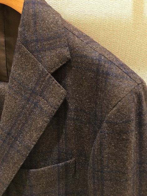秋らしい深みのあるブラウンに、濃いネイビーと淡めのブルーのペーンが入っており、非常に洒落てます。また、フランネルのような縮絨素材で、秋冬らしい質感になってます。