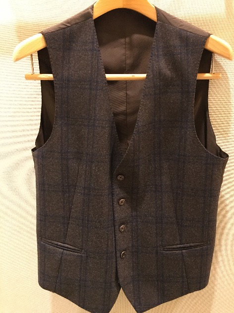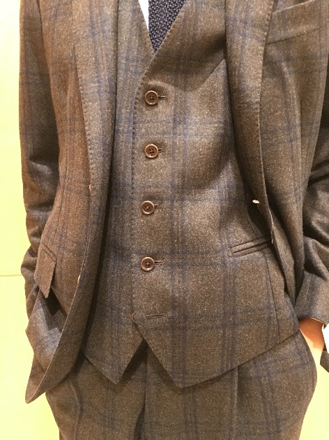 近くに寄ってみるとこのようや柄になっております。ブラウンとネイビーの色が入っているので、シャツやネクタイも色々楽しめそうです。