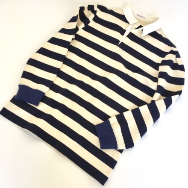 ラガーシャツは襟が大きく開き女性らしく着こなしていただけるデザイン。