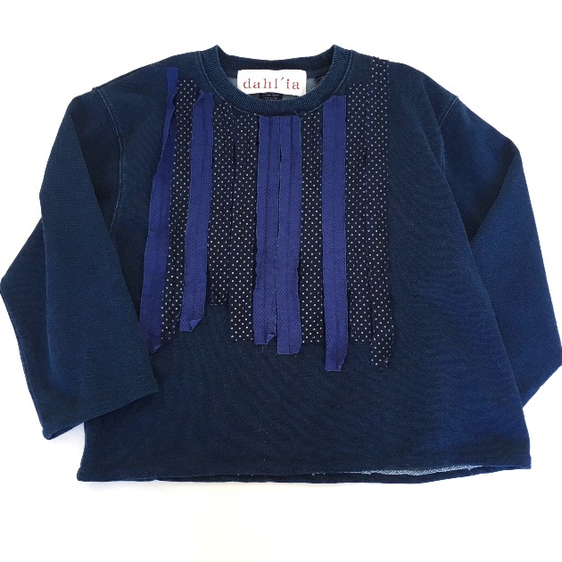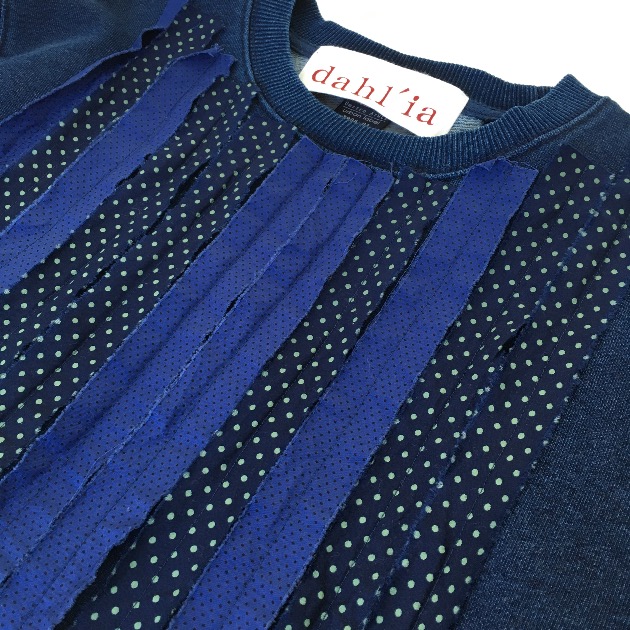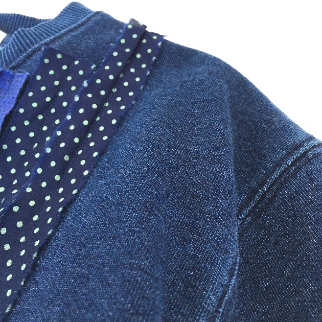 スウェットシャツをインディゴ染めし、ドットプリント生地をプラス。