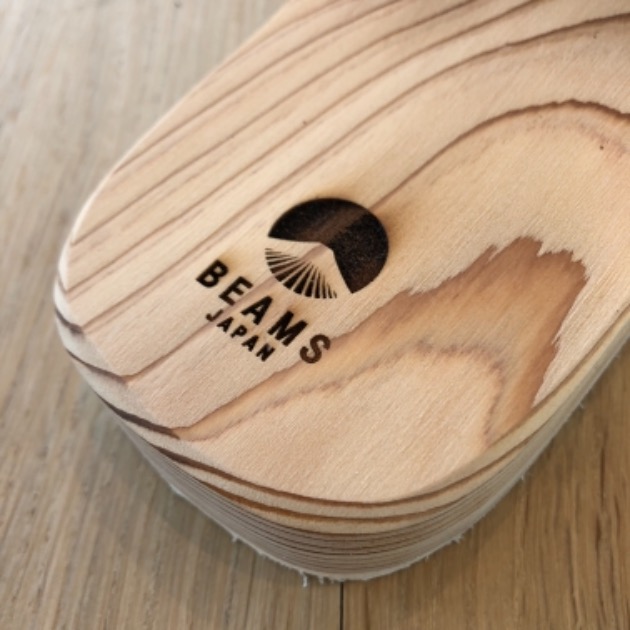 本体のかかと部分、ここには〈ビームス ジャパン〉のロゴが『焼印』によってしっかりとその存在を主張しています。更には、本体素材に『杉』を採用し、年輪や節と言った、自然が作る美しい模様は、このサンダルの持つ癒しに繋がっています。