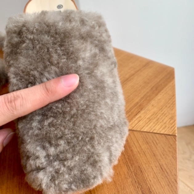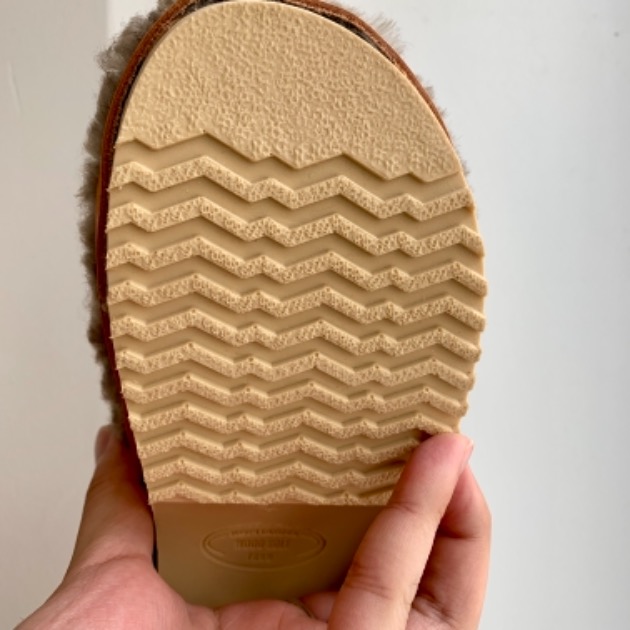 横から見ると、フワフワ(シープスキン)、レザー、木、ゴムソール、と、異素材の合わせをバランス良く配置しているのが分かります。