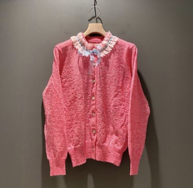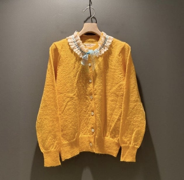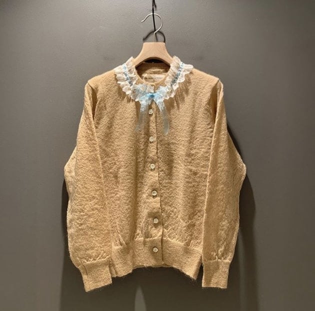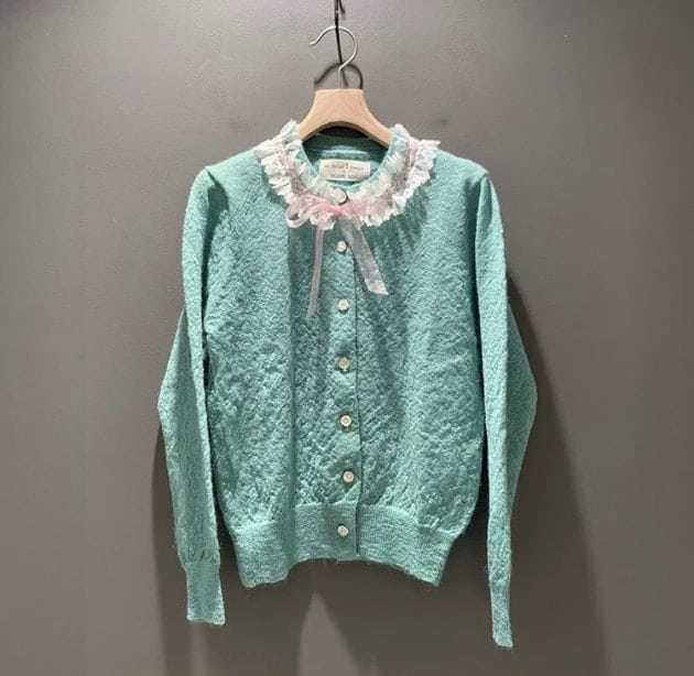 シンプルなカーディガンに、レースの襟、そしてビジューのボタンが施されています。