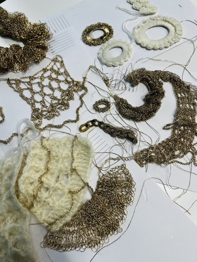 金や銀などの金属アクセサリーをつくるような感覚で、ニット科出身の石栗さんが、かぎ針でひたすら手編みをし、