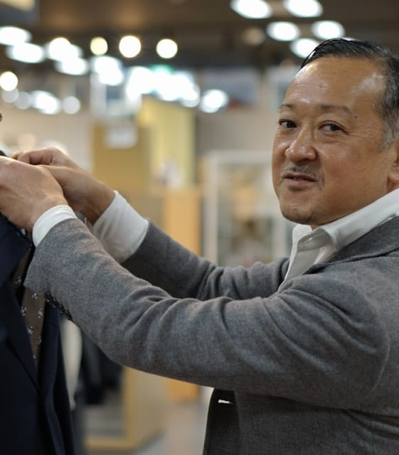 ネイビースーツにアズーロエマローネのVゾーンで構成したオーソドックスなスタイリングです。