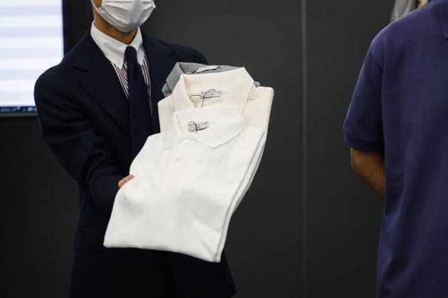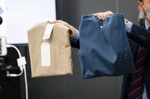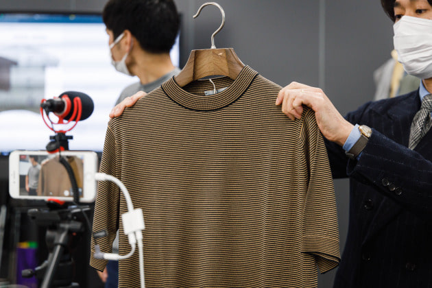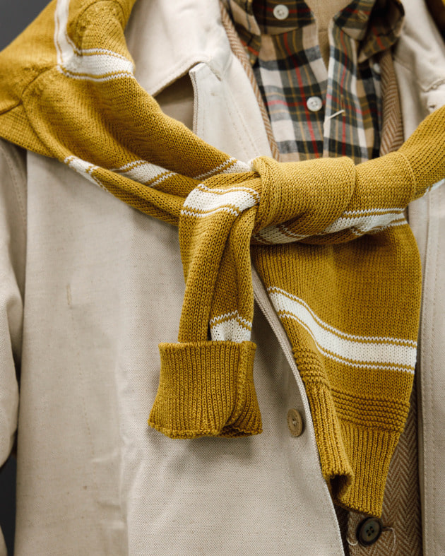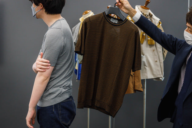 「ブライトな配色が非常に新鮮でシーズナルなカラーリングの一着です。ややシャリ感のある生地を使用しているので、気温が高い時期にも肌触り良く快適に着用できる仕上がりとなっています。こちらはモデルサンプルとなり、首回りと袖口、裾のエンドをブラウンで指定して別注しています。」
