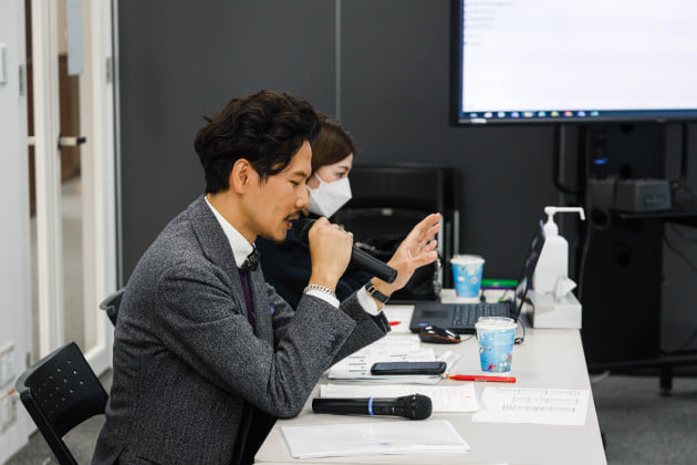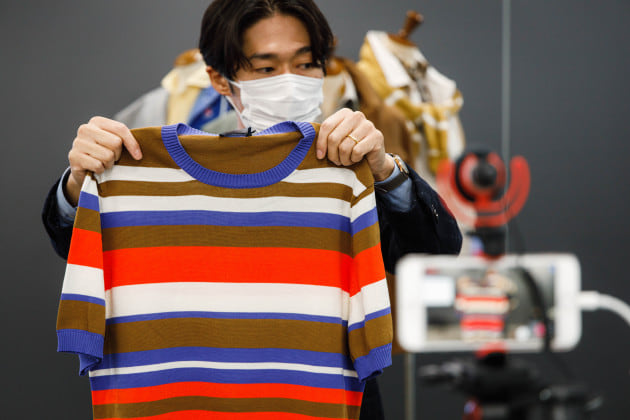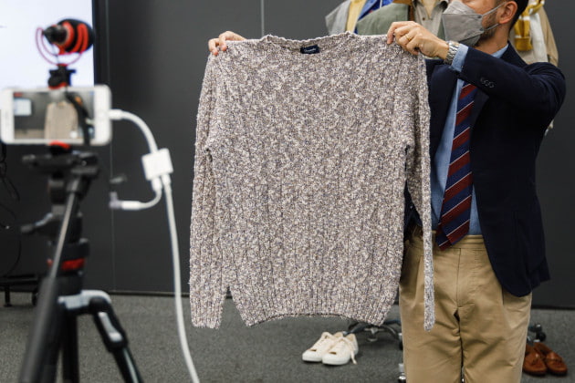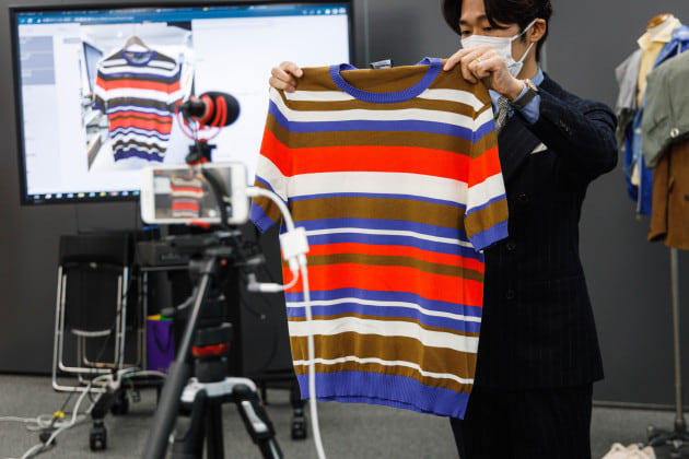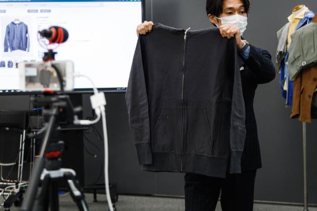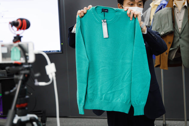 「トータルブランドとして様々なアイテムを展開していますが、今回はこちらのニット一つに絞ってバイイングいたしました。リネン×コットンのやや透け感のあるメッシュニット素材のサマーセーターです。柔らかくもハリのある質感に優雅なシルエット、そして上品なカラーリング。非常にエレガントな魅力を感じます。ちなみにニットは英国の自社工場で全ての工程を一貫して行っており、厳格な品質管理のもと生産されています。故にアイテムとしての質は間違いのない一着。こちらのサンプルからサイズバランス調整していますので、着丈などもう少し短くなる予定です。」