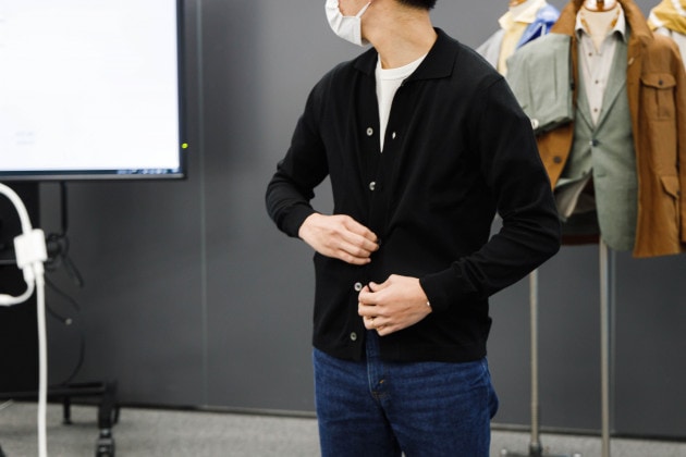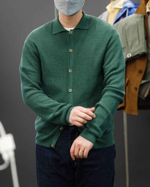 「〈MORGANO〉のシャツカーディガン。リラックススタイルがムードとなっている中でジャケット代わりとして羽織れ、かつレイヤードもできるような、汎用性の高い一着をバイイングしています。都会的なブラックと旬なグリーンの展開です。同ブランドでは他に、人気のチルデンセーターとリラックスフィットのニットTシャツを予定しています。」