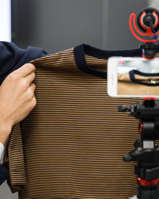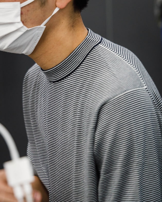「モックネックよりも低く、クルーネックよりもほんの少し高い。そんな絶妙な見え方に拘って作った一着です。モダンフィットのボディに、載せているボーダーはブランドのクラシックなミニボーダーと、オーセンティックな見せ方を追求しています。大人っぽく上品だけど抜け感がある、そんな空気感を表現できる仕上がりです。」