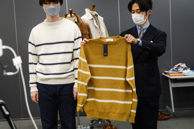 「続いてこちらも別注。マイクロボーダーのクルーネックニットです。先ほどのものよりもほんの少しピッチを広げてボーダーを組んでいます。サンプルが小さく、ややタイトに見えますが、実際はリラックスしたサイズ感で着こなせるアイテム。配色も全て指定させていただいた、拘りの一着です。」