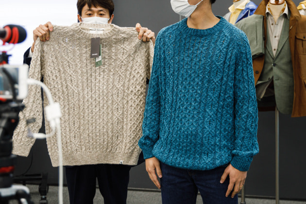 「コットンリネンのケーブルセーター。こちらもモデルサンプルで、実際にはオフホワイトでオーダーしています。やや変形したケーブルが良い表情の一着です。」