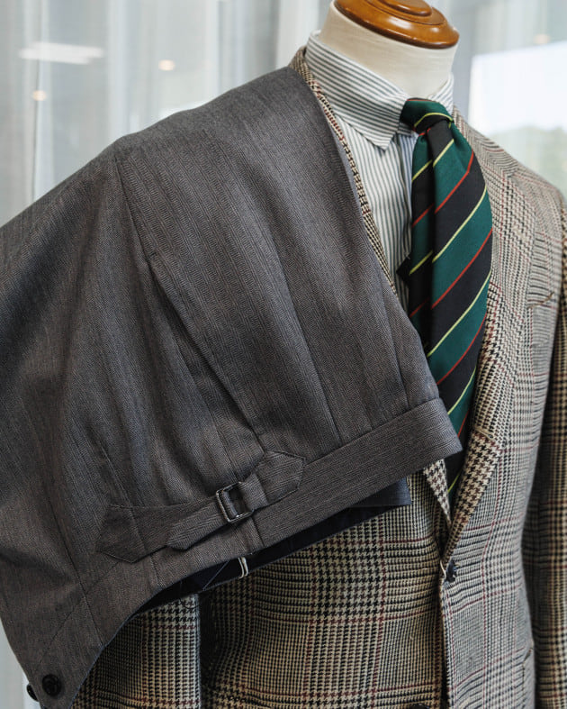 パンツはグレーのウールパンツ。チノやデニムだとちょっとそれっぽすぎるかなと思い、品の良さを入れました。クラシックな英国のビスポーク由来のパンツを合わせていますが、このぐらいのトーンであればどんなディテールでもハマってくれると思います。