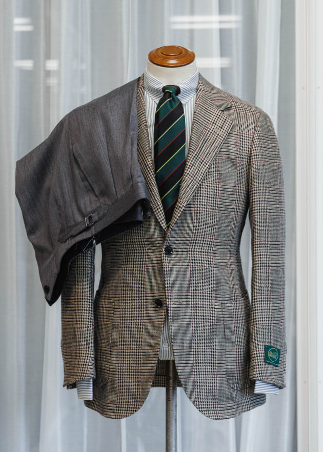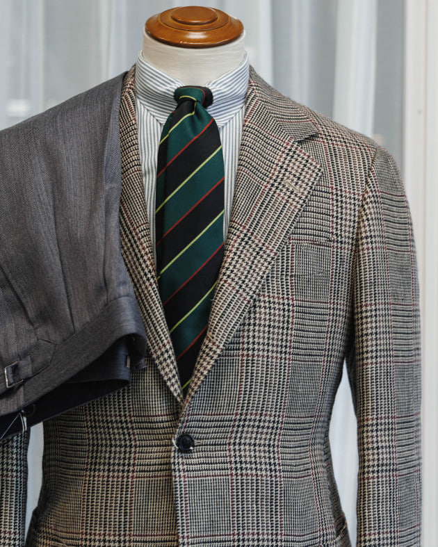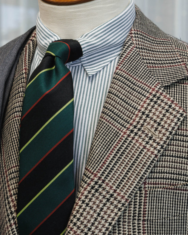 全て柄で構成したVゾーン。少し粗野な、野暮ったい空気感を含ませるため、ジャケットとシャツは敢えてピッチを合わせ、色も馴染ませていないコンビネーションにしました。タイは直球の配色のレジメンタル。シャツ、ジャケットの色を拾いつつ力強く。