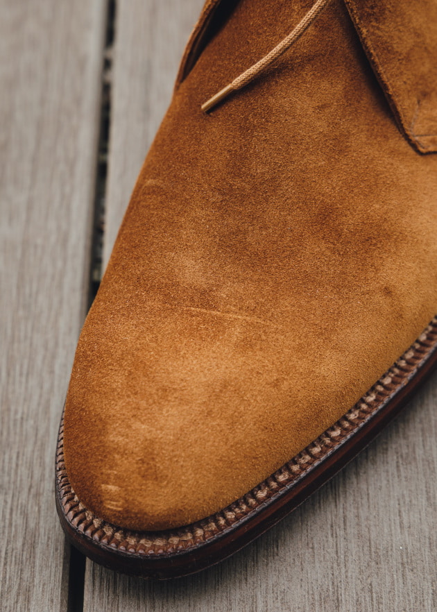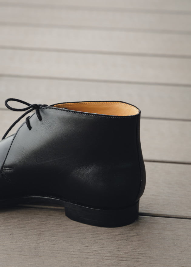 ショートノーズのプレーンフロントが特徴的な2アイレットのダービーチャッカブーツ。無駄のないシンプルなデザインが故、極上のヨーロピアンカーフの質感がより引き立ち、美しく輝きます。
