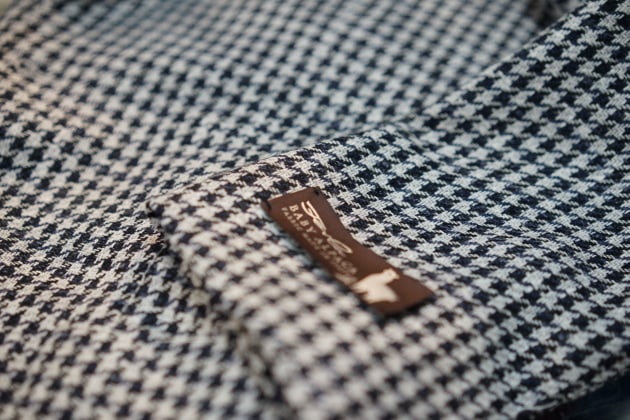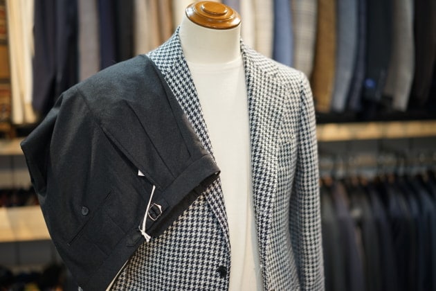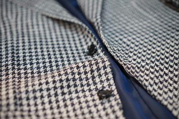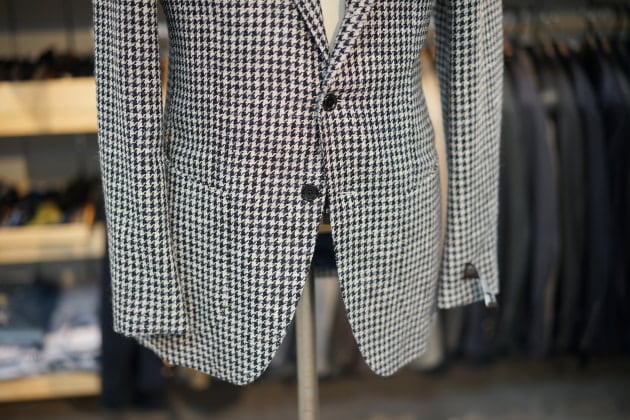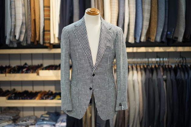 こちらのジャケットの魅力は、コントラストを効かせたハウンドトゥース柄で