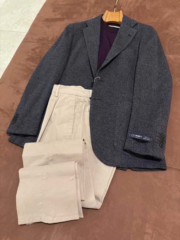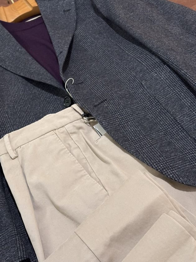 例えばこのような感じですね。インナーには<LORENZONI>の14ゲージハイネックニットを合わせました。GREYカラーのジャケットに合わせるパンツの色をよく聞かれるのですが、