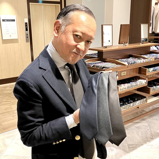 そして伊藤にこのスペシャルネクタイのこだわりの部分を聞いて見ました。伊藤の話しでは「芯地を多少厚くして、どんな結び方をしてもノットがきれいになるようにしている」との事です。ディンプルもきれいに出ていますね。ディンプルを入れなくてもとてもきれいな印象です。芯地一つでこのように変わるんですね。「MASTER PLAN」さまの商品に対するこだわりが感じられます。