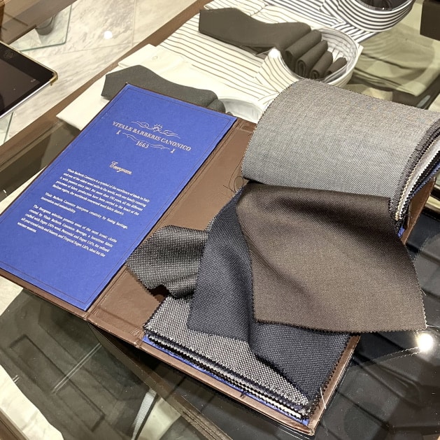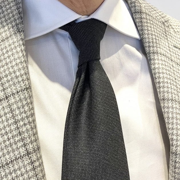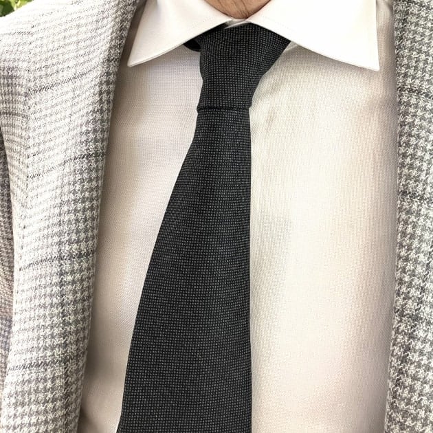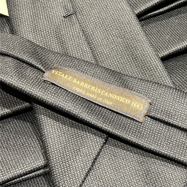 ネクタイの素材は<VITALE BARBERIS CANONICO / ビターレ バルべリス カノニコ>日本では「カノニコ」の名前で有名なスーツ用の服地バンチから選んだという事です。チャコールとネイビーは「バーズアイ織り」ダークブラウンは織り柄のない平織り組織です。