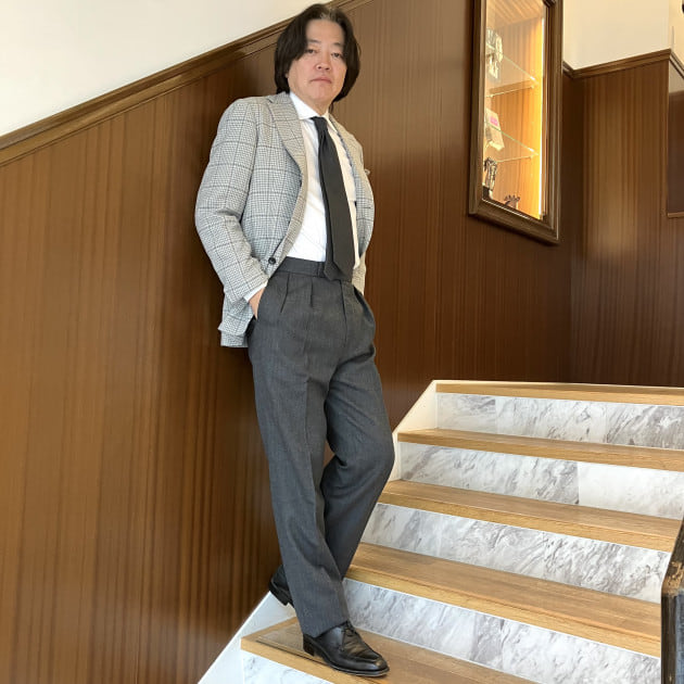 ボトムスは<Fumiya Hirano THE TROUSERS / フミヤ ヒラノ ザ トラウザース>のサージ素材の2インプリーツです。股上が深めでインプリーツなのでよりドレッシーな印象に見えますね。英国ビスポークのディテールを踏襲したエレガントなパンツです。
