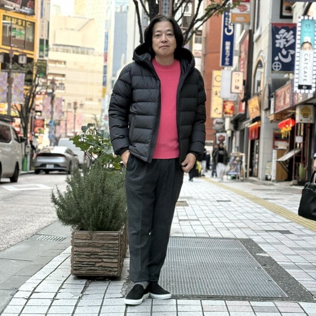 全身のコーディネートはこのような感じになりました。多色使いをせずにピンクのニットのインナーをアクセントとしたとてもきれいなドレスカジュアルスタイルですね。「寒くなってきたから」なんていう形容詞をお題に付けてしまったので伊藤はダウンジャケットを選んだのでしょう。
