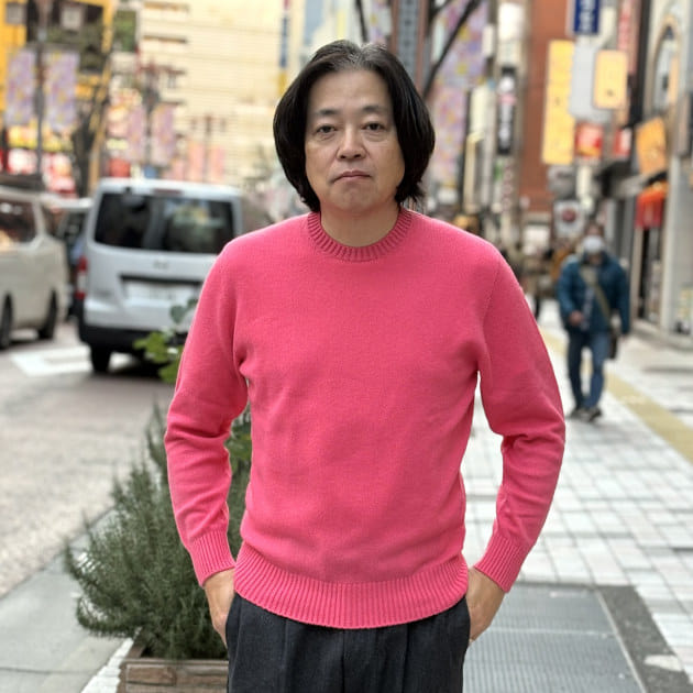 色目もこのようにきれいな発色のカラーからベーシックなカラーまでいろいろとご用意しております。ホワイトやベージュ、ネイビーといったカラーはジャケットのインナーに着るのでしたら万能にお使いいただけると思います。よく店頭でお客様から「カラーニットをどのように着ればよいのかわからない」とのお問い合わせをいただくことがありますが、今回の伊藤が組んだコーディネートのようにカラーニットを着たらその他のアイテムはベーシックカラーにすればコーディネートを失敗することはありません。お選びになるのはご自分のお好きなカラーが良いと思います。私でしたらやはりこのピンクが一番好きですね