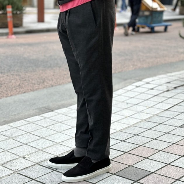 それでは伊藤が組んだコーディネートに使われているアイテムをご紹介いたします。パンツは<GIAB'S ARCHIVIO / ジャブス アルキビオ>の「MASACCIO TYPE2 / マサッチョ タイプ2」です。このモデルはビームスの別注モデルで元々インラインにある「MASACCIO」はノープリーツですがビームスのモデルは1プリーツにしてフィット感にも若干のゆとりを加えています。プリーツがあるので腰回りに余裕が生まれ、裾にかけてのテーパードラインがとてもきれいに見える足長効果のある美脚パンツです。