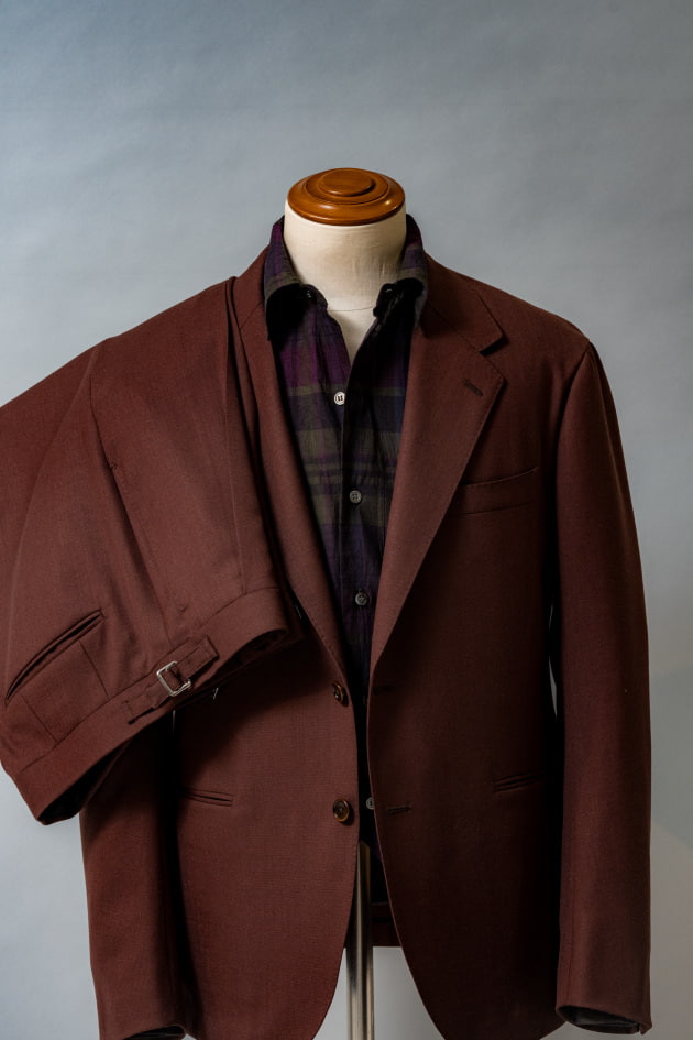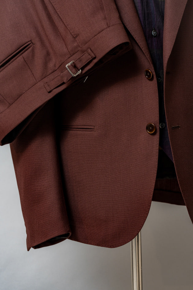ウール100%ながらモヘア混のようなシャリ感があり、程よいドレープ感と上質なウールならではの微光沢がより高級感を感じます。