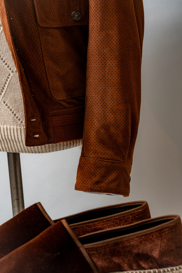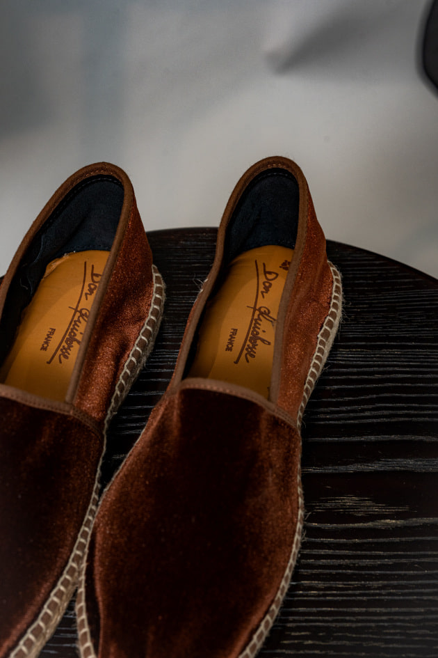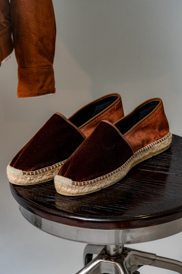 足もとまでスエードだとうるさい、表側だとちょっと硬いのでベルベットのエスパドリーユを。素材感を合わせながら柔らかい印象が保ってているかなと。