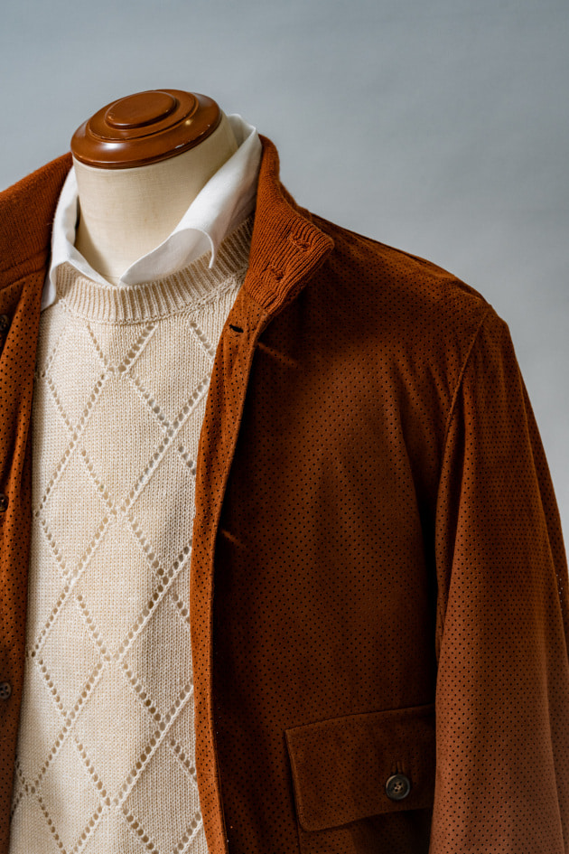 <CINQUANTA(チンクワンタ)>はビームス50周年記念別注のパンチングスエードを採用したドライビングブルゾンのコーディネート。こちらのドライビングブルゾン、実はすでに入荷してきておりますが、全て予約でのお取り置き中。気になる方はキャンセル待ちを。