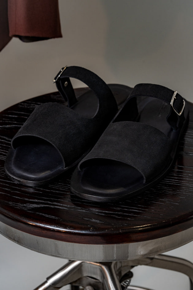 それにレザーサンダルを合わせています。オンオフの狭間のようなスタイルですね。前述のようにオフィスカジュアルで使う際はレザースニーカーやローファーがいいでしょう。