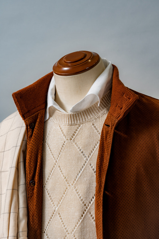 インナーのシャツも、ボタンダウンシャツやラコステポロシャツなどを合わせるとトラッドなので、そうなりすぎないように白のリネンシャツにしています。