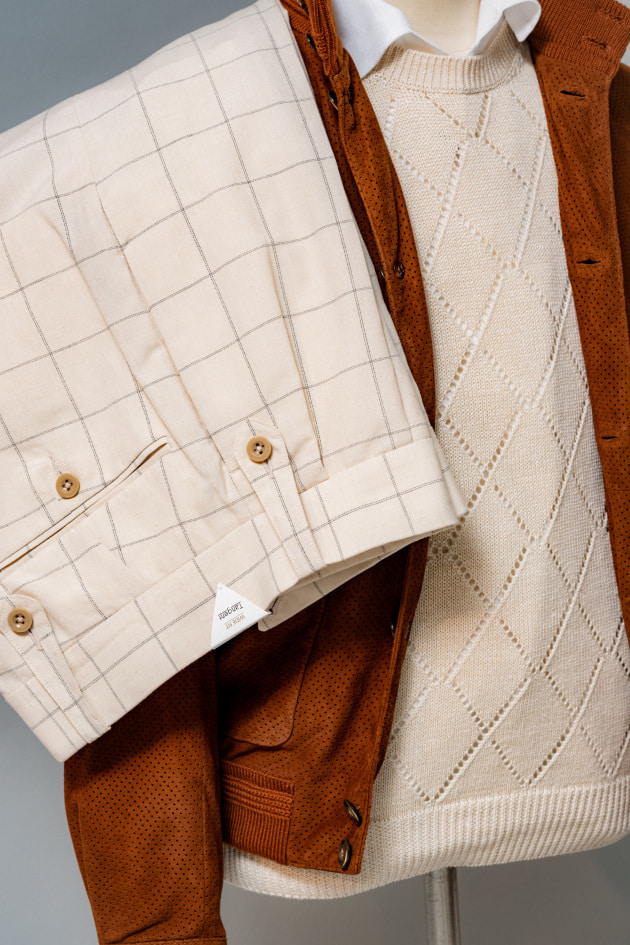 パンツも5ポケットパンツだとトラッドなので<Tangent>のオフホワイトチェックのワイドパンツ、実際に履くとかなり優雅なAラインシルエットなので、トラッド感を払拭。