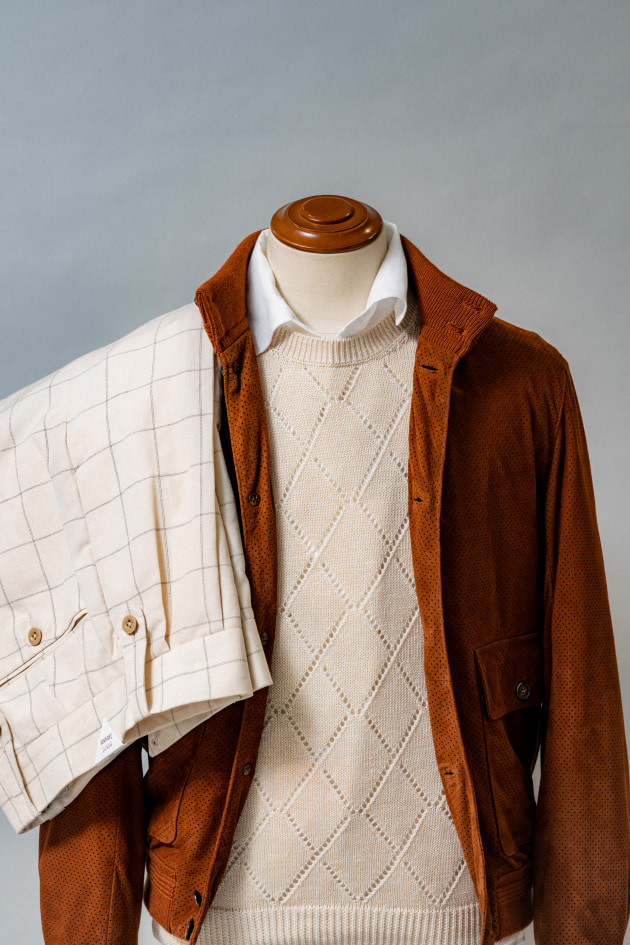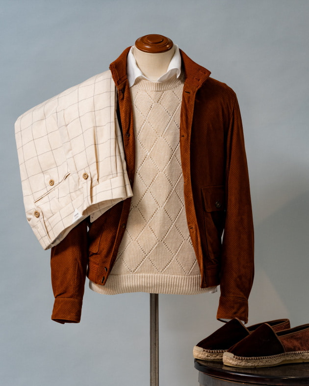 定番のスエードドライビングブルゾンが夏以外着用できるブルゾンですが、こちらはやや夏よりの涼しげなコーディネートにまとまってますね。