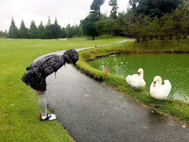 ↑(Aikoちゃんが白鳥さんにお礼とお詫びの図^^;(笑))その昔、このパー5でシャンクしたボールが何度もバウンドして白鳥の胸に当たり池に入るのを免れたことがあるんです^ ^