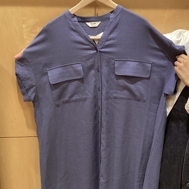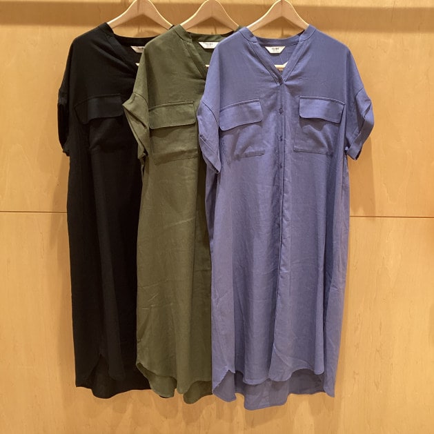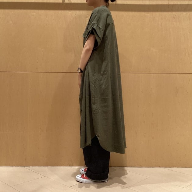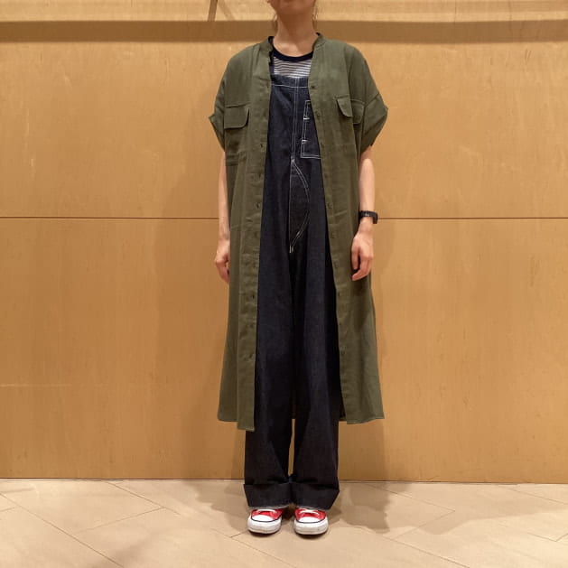 大きなポケットが目を惹くこちらのワンピースはサラリと一枚で着るのはもちろん、フロントのボタンを開けて羽織りとしても使えます〜