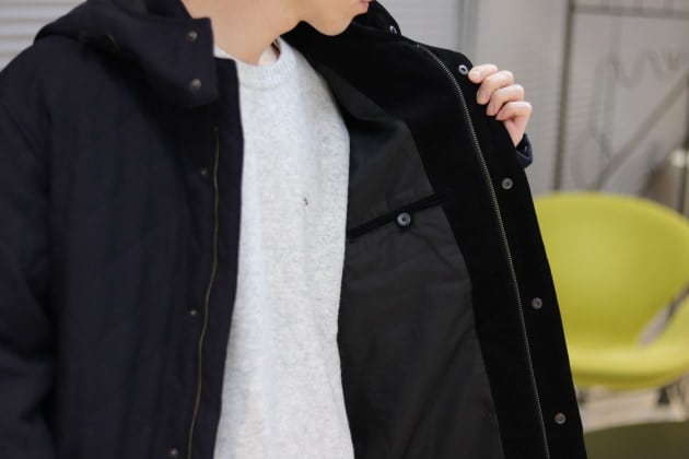 防風性を高めるジップと比翼仕様に加えて、襟元など各所にコーデュロイ素材を配し、クラシックな雰囲気を高めています。