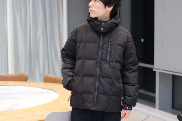 このダウンジャケットは、洗練された印象を与える鈍い光沢感のある表地と、